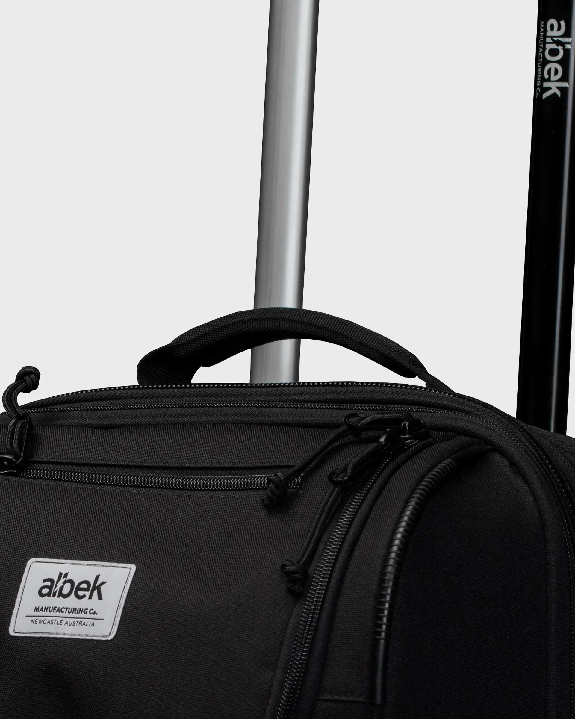 A laser-etched, two-stage telescopic handle adjusts in a click. Albek Cush™ carry handles sit comfortably in hand. An internal-external Ezy-Access pocket gives fast reach to travel essentials. Lockable #10 zippers keep things secure.