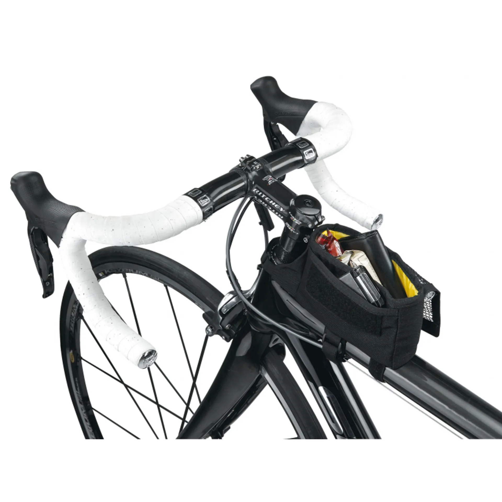 The TriBag quickly mounts to the top tube of your bike for quick and easy access to energy bars or any small essential gear you need to keep close at hand. Two side pockets for extra capacity. Large size fits smartphones with screens up to 6”.