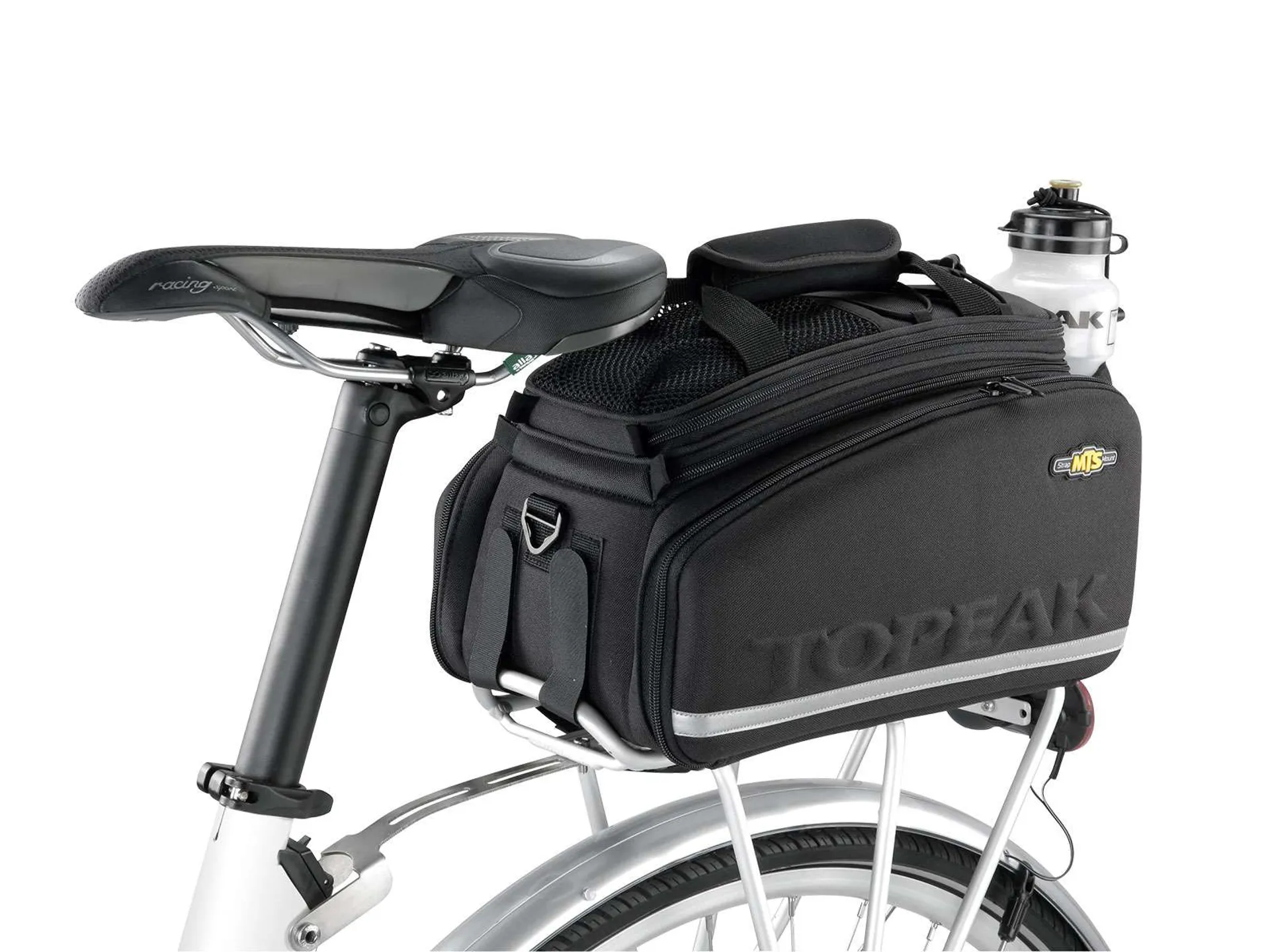 Divided main compartment and side panels expand for extra storage capacity. Rear water bottle holder lets you carry more water on extended trips. Attaches with integrated straps. Pannier deployment requires a beam rack with side frames attached or a traditional rack with struts to prevent panniers from contacting rear wheel.