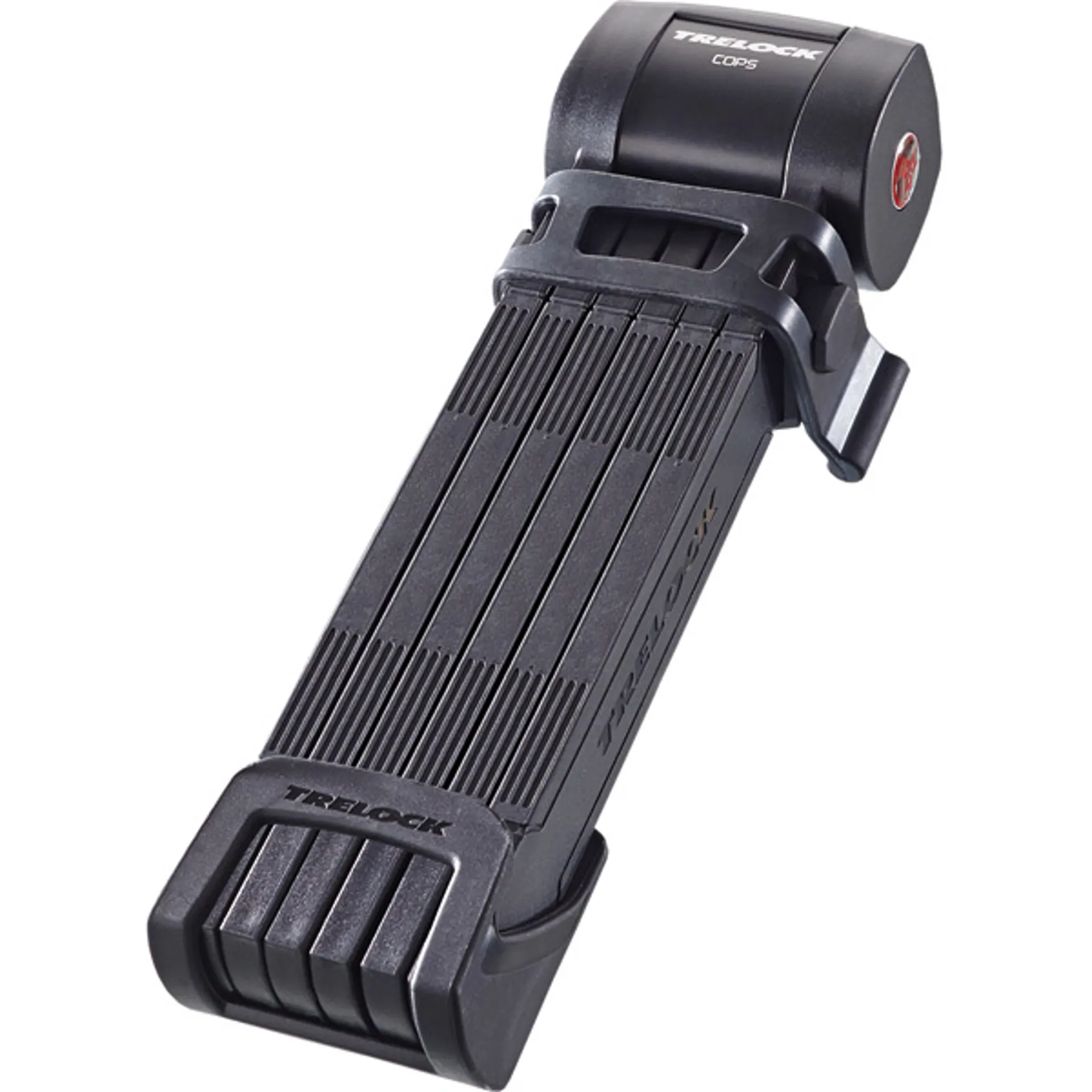 Trelock folding locks are characterised by their strong, flexible hinge pins (security link). The fs 460 cops® convinces with the trelock in-x® inline cylinder, its corrosion protection, a dust cover cap and rubberized rods to prevent paint damage. In its elegant design, the new fs 460 cops® offers security against professional crackers. With a length of 100 cm, it is ideally adapted to the cyclist's need to lock the bicycle to a larger object, such as a street lamp, or to fix two wheels together. With its new x-move holder for the fs 460 cops® folding lock, trelock offers cyclists variability and versatility. The new x-move holder enables vibration-proof, easy transport. Thanks to the new holder, the folding locks can be easily removed from all sides. The innovative x-move holder makes the trelock folding locks very easy to use. The holder is equipped with an easy-to-operate tab and can be fixed for left- and right-handed users. In addition, the holder can be attached to bicycle frames with different geometries and offers vibration-proof transport.