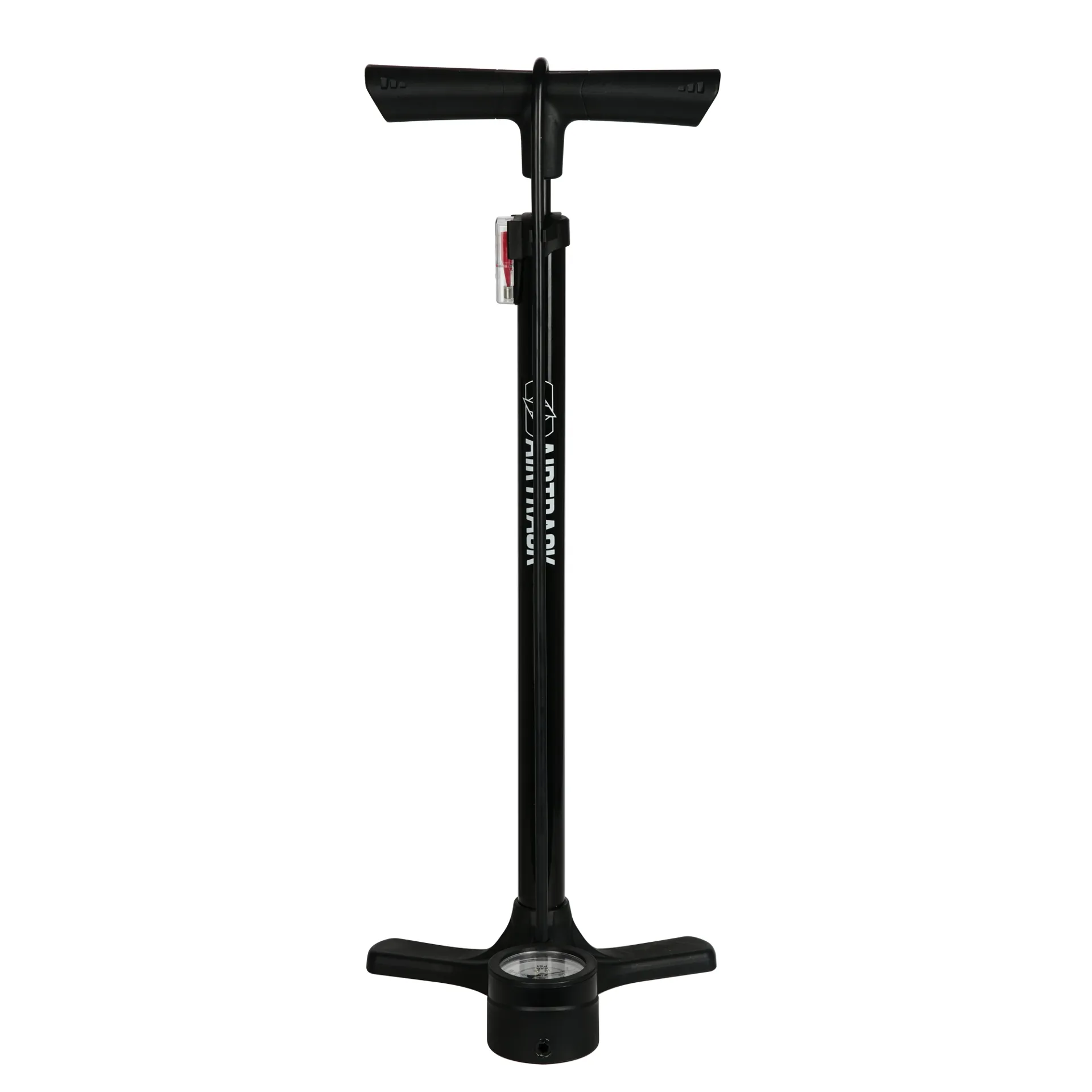 The Airtrack Workshop Steel Floor Pump with gauge has a dual valve head for Presta and Schrader valves.