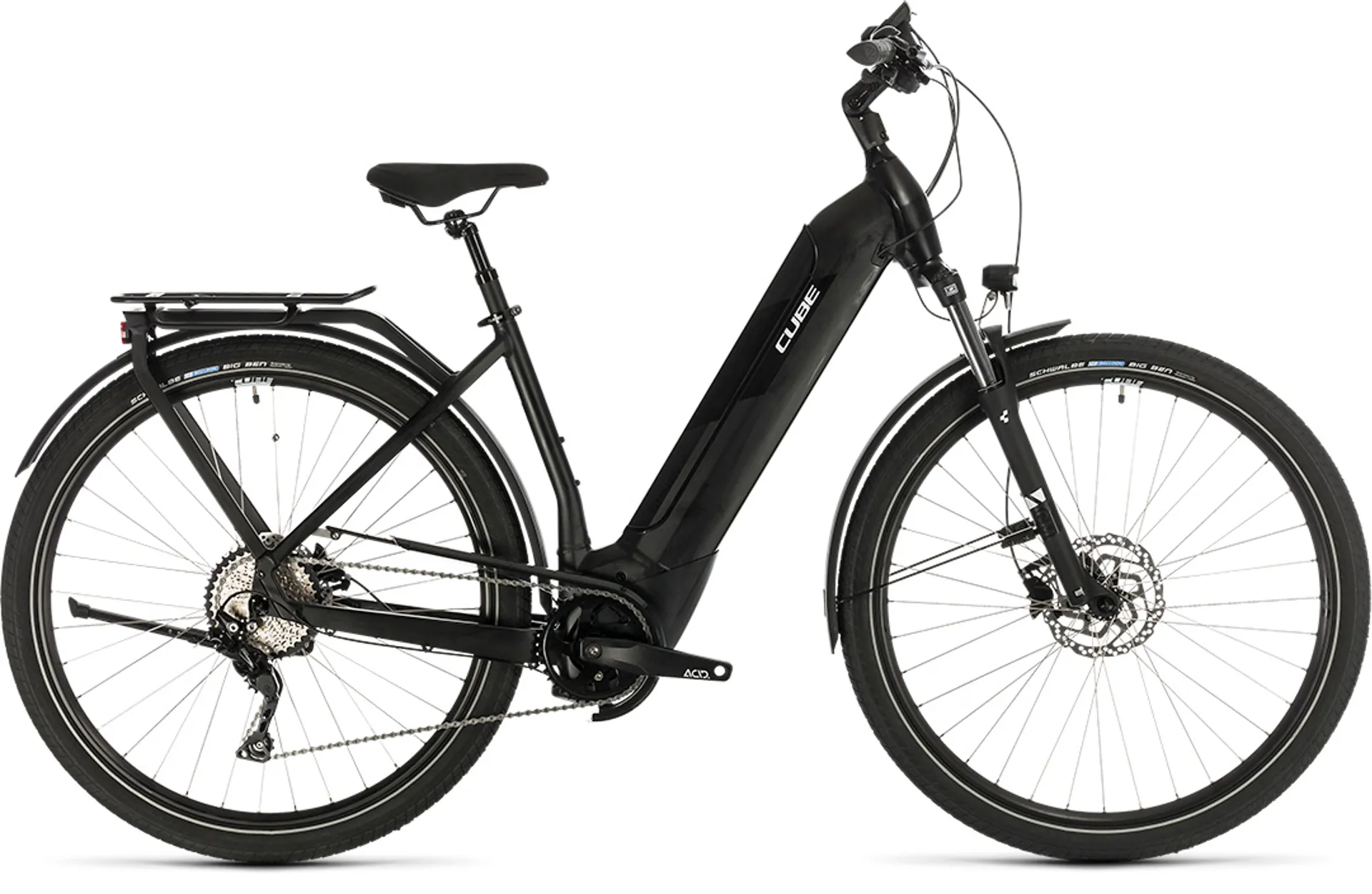 If there's one bike in the CUBE range that symbolises the freedom of two-wheeled exploration, it's this: the brand-new Kathmandu Hybrid Pro. Whether you're an occasional commuter or regular cyclist; whether you ride to get around the city or to escape into the countryside at the weekends, this is a bike to feed your sense of adventure. With a completely revised frame and new, fourth-generation Bosch CX drive unit mated to Shimano's reliable 10-speed Deore transmission, our design team pulled out all the stops to create an adaptable, versatile ride companion. From the Integrated Carrier 2.0 to the tapered head tube and fully enclosed, CUBE Modular Battery System, every detail of the Kathmandu Hybrid Pro's chassis is designed for strength, stiffness and durability – a fact that we've proved in our in-house test lab. And, with a choice of Easy Entry, Trapeze or Men's frames, there's a Kathmandu Hybrid Pro to suit any rider. But it's not just about function, because it wouldn't be a CUBE Hybrid if it didn't also have elegant lines and incredibly easy, intuitive handling thanks to its low centre of gravity. With a tough Suntour suspension fork featuring 100mm of travel and a suspension seat post too, you're assured of a comfortable ride on even the roughest of road surfaces. Grippy Schwalbe tyres and powerful Shimano hydraulic disc brakes ensure that you always have full control, no matter what the weather. And practical touches like the full-length mudguards, integrated lighting system and CUBE kickstand mean you're fully equipped for wherever your busy life – or your curiosity – takes you. We've thought of everything, so you can just enjoy the ride.