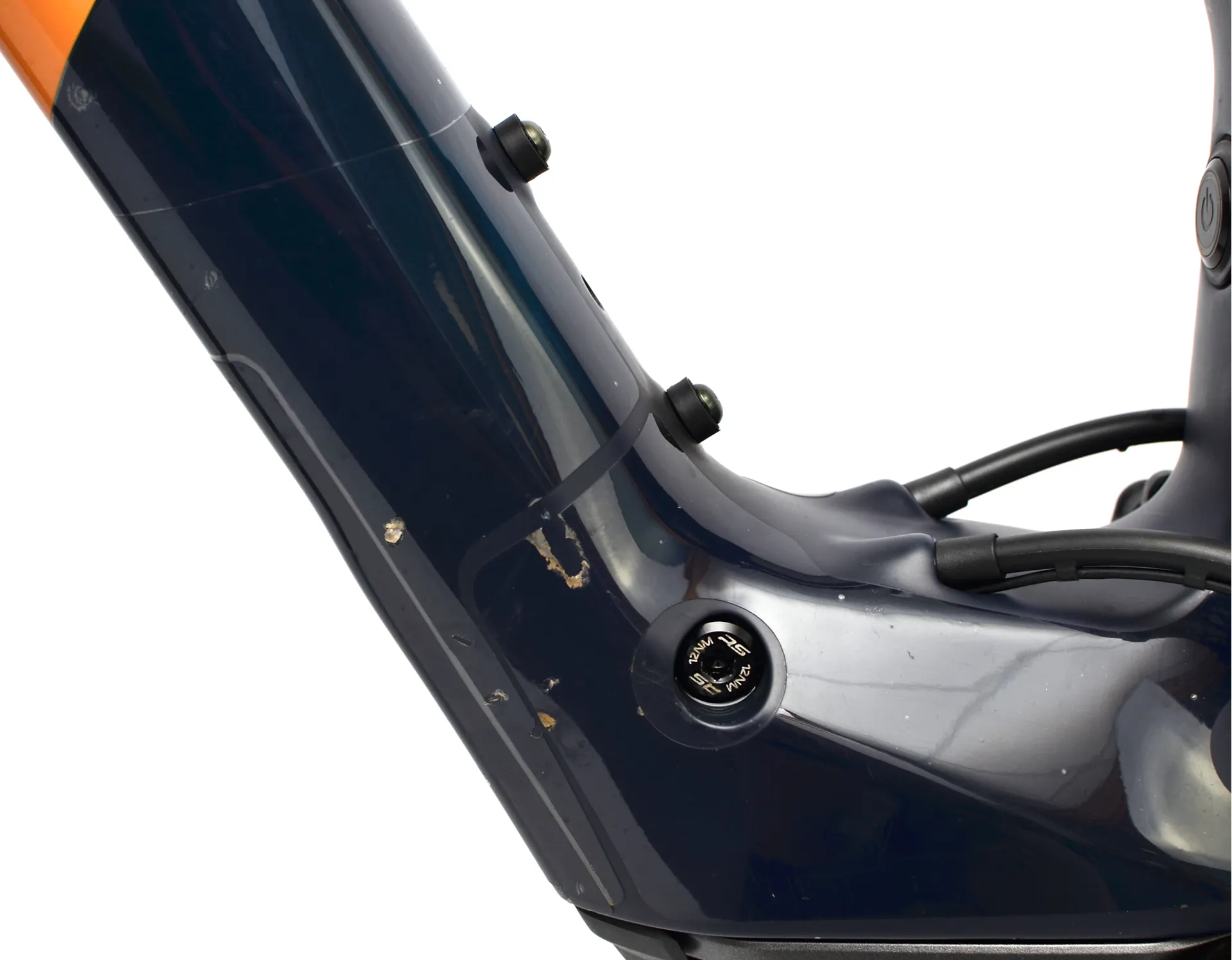 This bike has cosmetic damage to the head tube, crank arms, rear derailleur, top tube, wheel rims, chain stay and seat stay. The bike's odometer reads 2334 km covered. We have taken pictures of the cosmetic imperfections, please inspect the images before making a purchase.