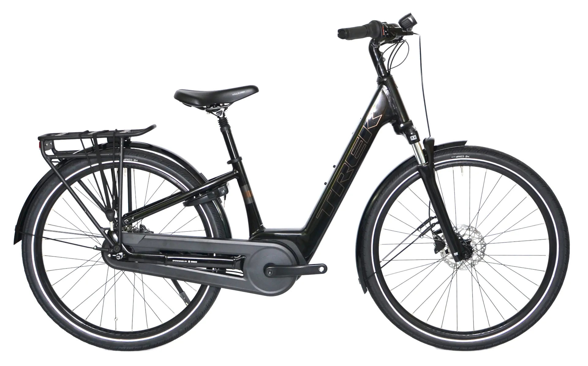 A lightweight Alpha Smooth Aluminium frame with a lowstep frame and internal cable routing, a Bosch Active Line Plus (250 W, 50 Nm) motor for speeds up to 15 mph, a 400 Wh PowerTube battery and Bosch smart system Purion controller with an LED remote. Plus, a dependable and low-maintenance Shimano Nexus 7-speed internal drivetrain, a suspension seat post, a Forklight 3.0 suspension fork with integrated Daytime Running Light, powerful hydraulic disc brakes, rear light, a MIK rear and side rack, mudguards, ergonomic grips and a comfy Bontrager saddle.