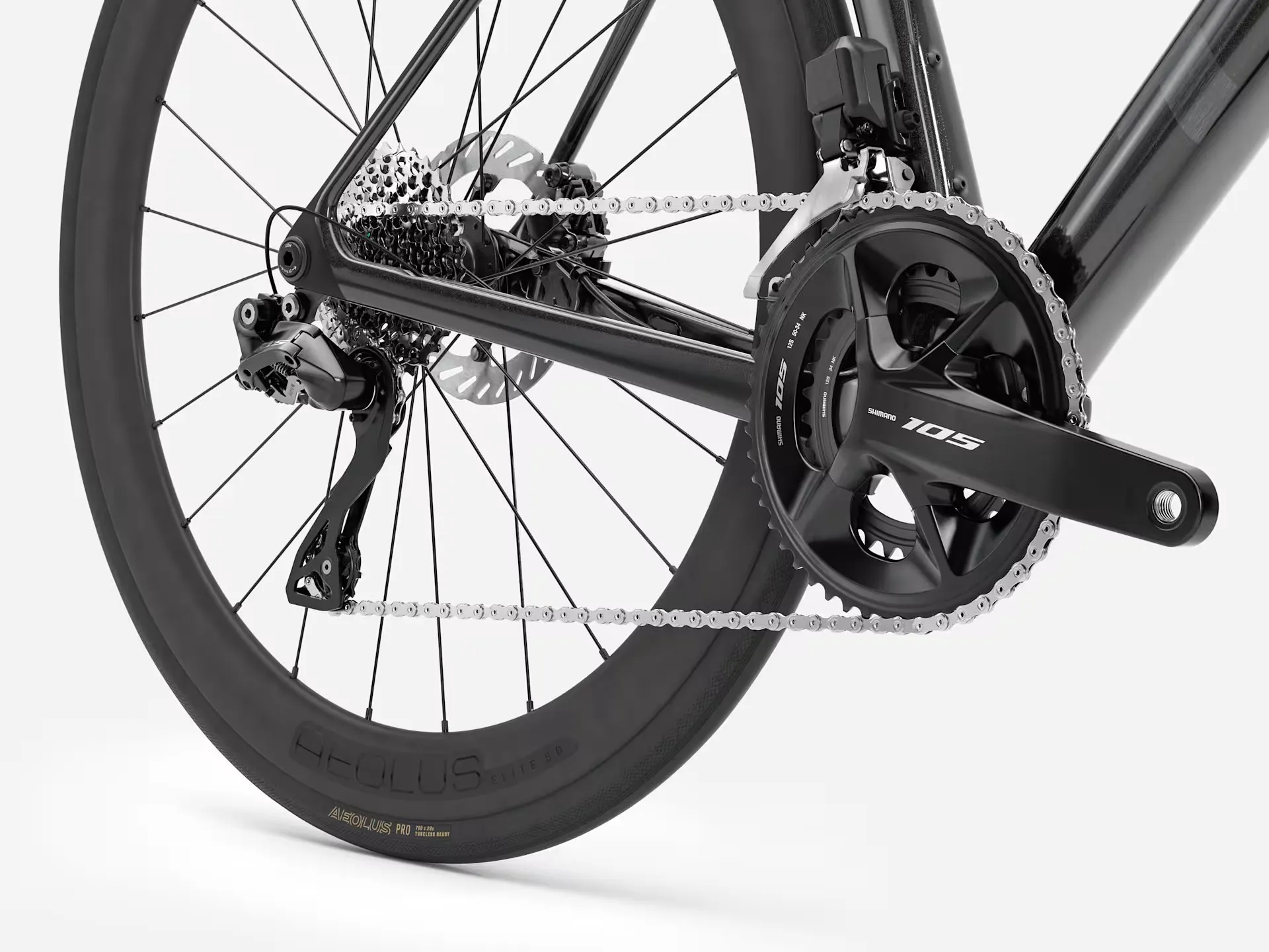 • Bontrager Aeolus Elite 50 Carbon Wheelset – deep-section aero rims, tubeless ready